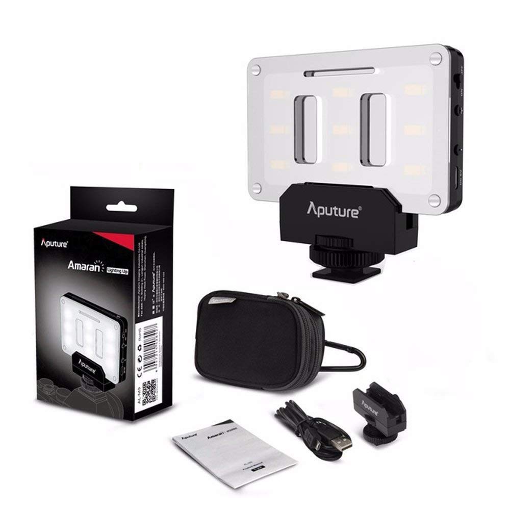Aputure Amaran AL-M9 LED panel A handy little battery powered and USB chargeable LED panel. Comes with a clamp to mount on your hotshoe and also comes with an orange and blue gel, a frosted piece of paper and a plastic diffuser that attaches with magnets. Small and lightweight, it's always in my bag!